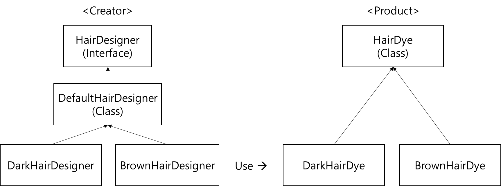 HairDesigner(Creator)와 HairDye(Product)로 팩토리 메소드 패턴을 구현한다면