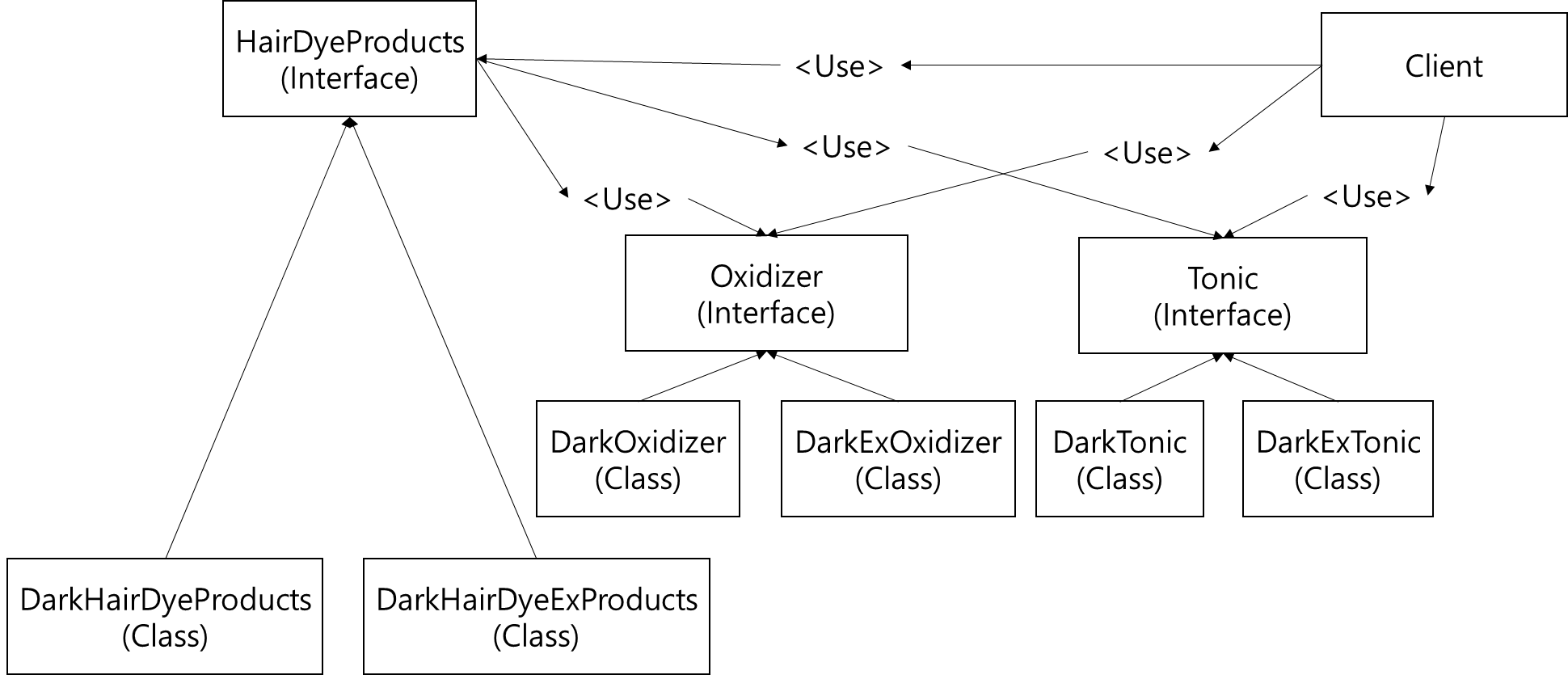 기존 DarkHariDesigner에서 Oxidizer나 Tonic을 정의 하려면 new 인스턴스를 사용하기 때문에 의존성이 강하게 결합되어 있었지만, HairDyeProducts 인터페이스를 통해서 의존성의 결합을 느슨하게 변경했다.