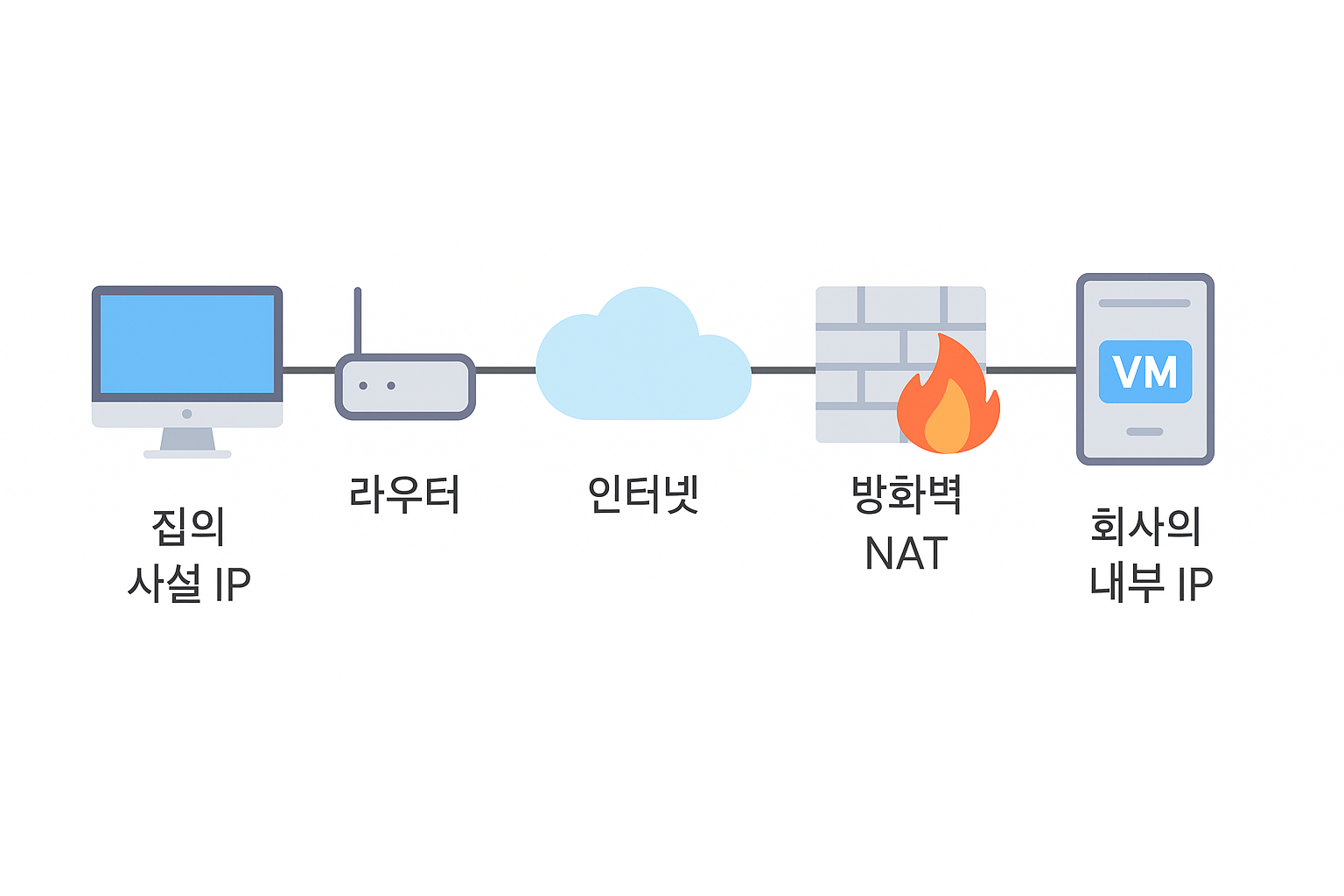회사에서 사용하는 단말(ex. PC, 노트북 등)은 하나의 공인 IP를 가지고 내부적으로 사설 IP를 할당하여 사용한다. 집에서 회사 네트워크의 내부 작업환경(VM)에 접근을 하기 위해서 회사 공인 IP를 알아야 하며 공인 IP에 접근 했을 때, 내가 접근하려는 내부 IP의 시스템에 접근할 수 있도록 하려면 어떻게 해야할까.
