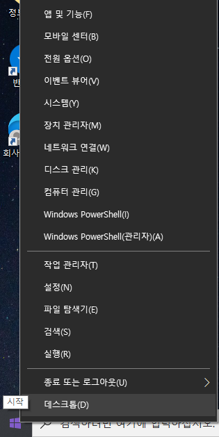 "시작" 로고의 마우스 오른쪽 버튼을 클릭하여