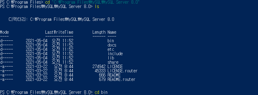 그 후 경로를 "mysql.exe"가 있는 파일로 이동 해야하는데