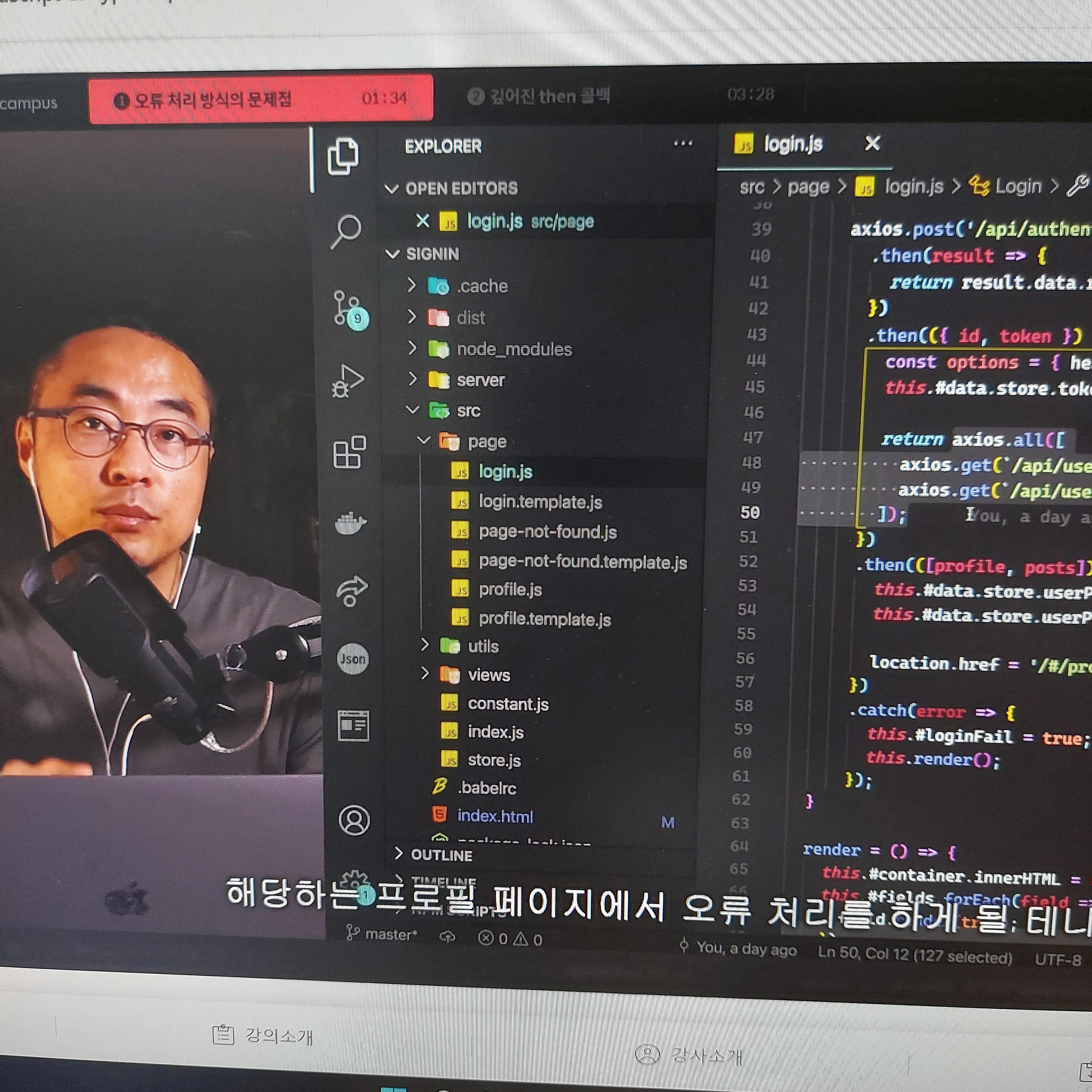 데이터를 처리하는 부분의 Promise리턴을 3번에 걸쳐서 한다. 여기서 한번 주의해서 봐야할 점은 catch() 부분이 하나라는 것이다. 그 말은 로그인을 실패해도 하나 있는 catch() 부분에 걸리고 로그인은 성공하더라도 사용자의 정보를 받아오는 부분, axios의 데이터를 가져오는 부분에서 실패하게되도 하나의 catch()에서 걸리게 된다. 따라서, 동작이 실패가 됐을 때, 어디에서 실패를 했는지 정확하게 알 수가 없다는 것이다.