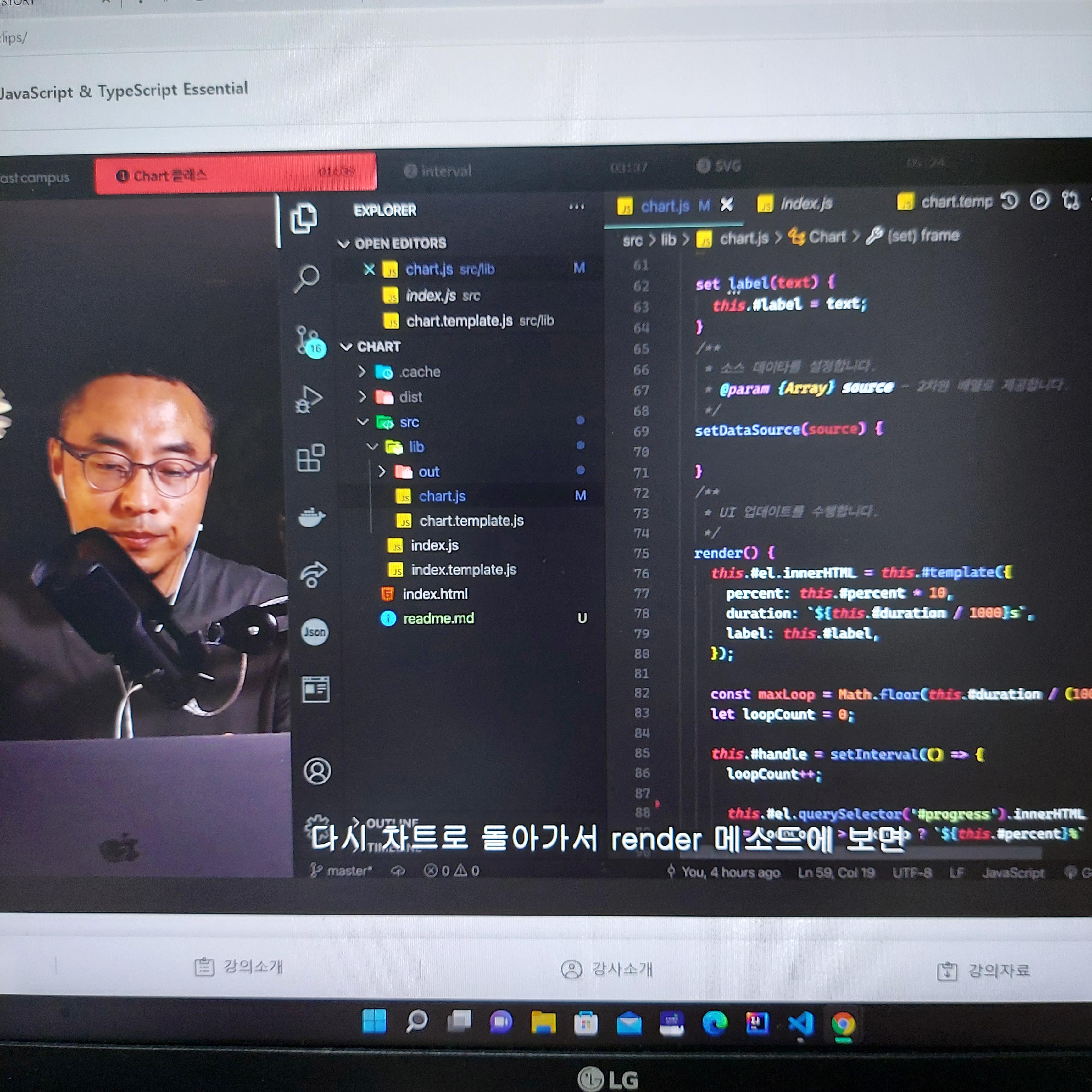 Chart 클래스를 보면 #이 포함된 변수는 private 형태로 외부의 접근을 제한하고 클래스 내부에서만 사용할 수 있다. 차트 라이브러리에서 설정 되는 값으로는 duration, frame, percent 등으로 차트의 각각의 속성 값들을 정의한다. 각각의 프로퍼티에 접근제한을 걸어두었기 때문에 setter와 getter를 통해 값을 반환하고 수정한다. 그리고 여느 다른 클래스 구조와 같이 render 메소드를 통해서 화면을 렌더링한다. render 메소드 안에 el(Element를 지정)태그를 통해서 템플릿을 만들고 차트가 동적으로 생성될 것이므로 지정해 놓은 duration와 frame을 기반해서 setInterval() 기능을 사용한다. setInterval()은 몇 초마다 실행되는 기능이므로 clearInterval() 함수로 꼭 끝나는 지점에 사용해야 한다. 그렇지 않으면 메모리의 낭비가 발생한다.