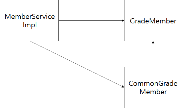 MemberServiceImpl 구현체가 GradeMember 인터페이스를 의존하면서 CommonGradeMember 구현체까지 의존하고 있다.