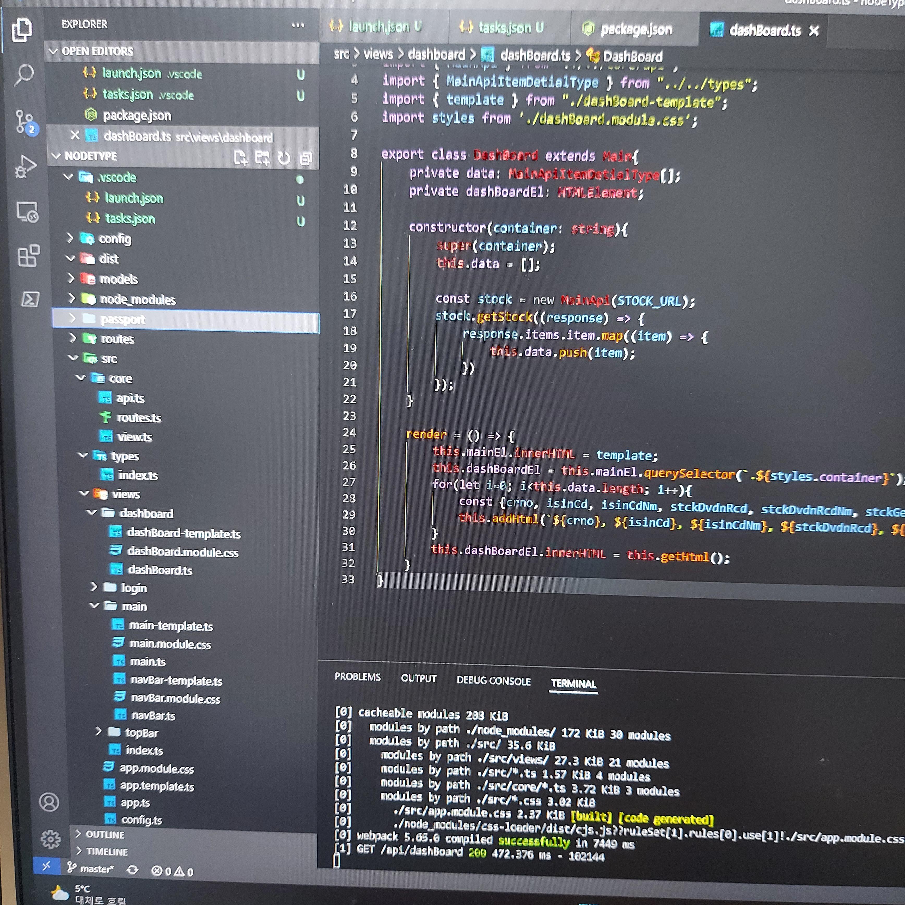 네 번째 사진은 작업하던 결과물이다. SPA형식으로 작업했으며 하얀색 텍스트로 나열 되어있는 데이터는 공공데이터 포털에서 가져온 데이터이다. 아직 진행중이지만 강의에서 듣고 알게된 내용들을 적용해야 할 부분이 많다. 지금은 3-4강의 기본적인 구조에 맞춰서 화면의 라우팅과 렌더링 등을 통한 SPA의 기능 구현 정도이다.