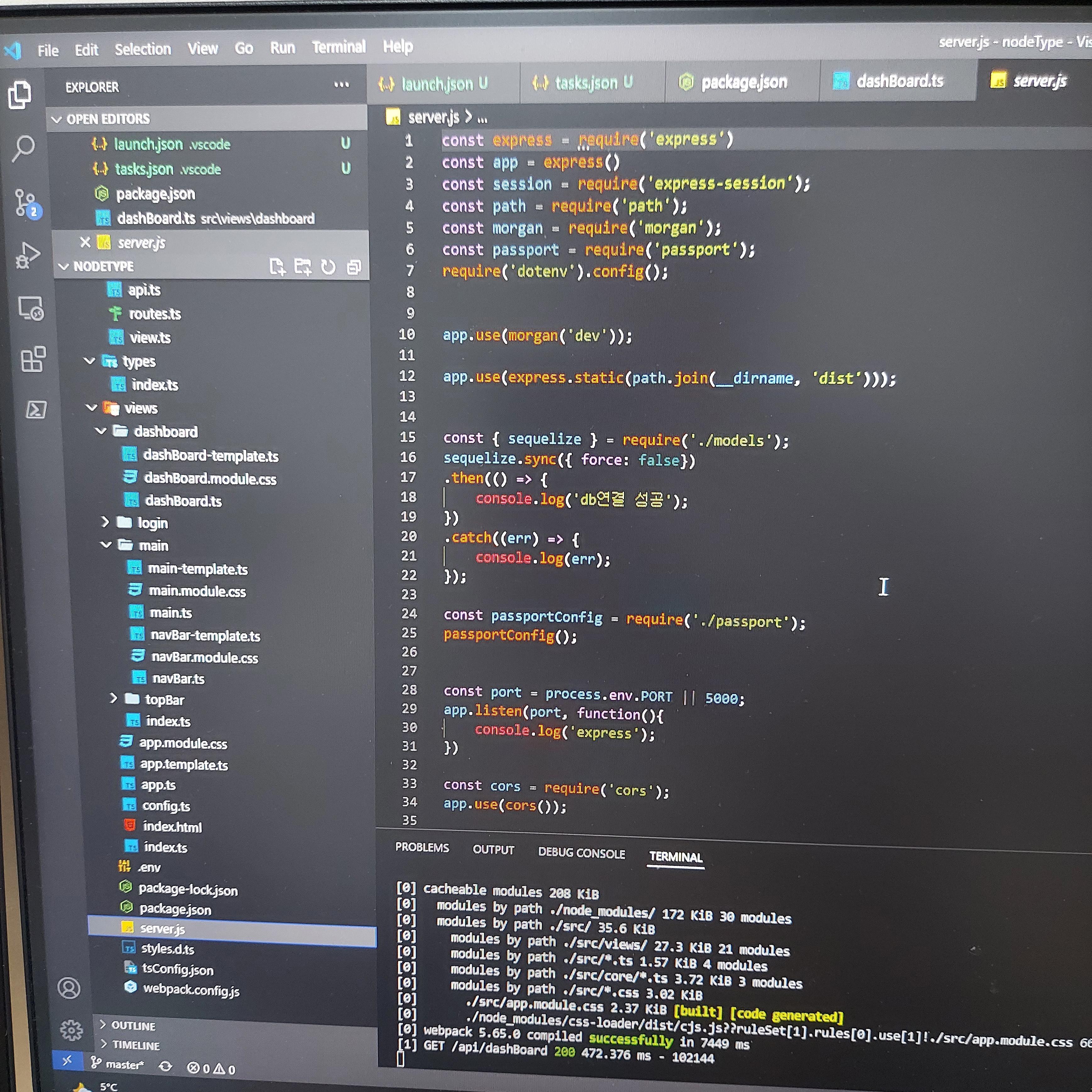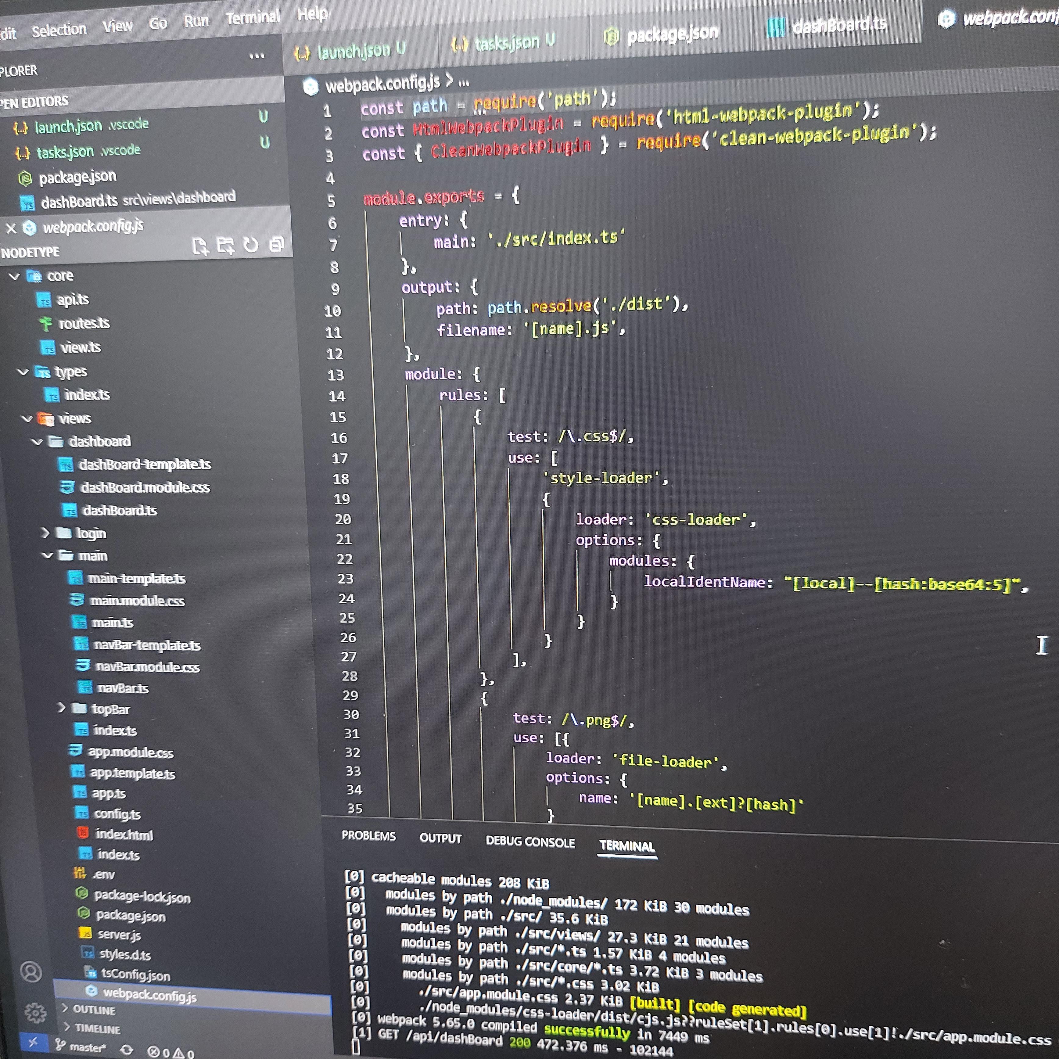세 번째 사진은 webpack 번들러를 사용한 것이다. 강의에서는 parcel을 통해서 번들링을 한다. 강의의 특성상 parcel을 사용하게되면 webpack보다 설정하는 부분에 있어서 빠르게 설정할 수 있는 이점이 있다. 하지만 webpack 필수적이라고 할 정도로 많은 어플리케이션에 사용되며 더 상세한 설정을 직접 할 수 있기 때문에 결과물에서는 webpack을 사용했다. html, css, JavaScript, TypeScript 등의 설정 등을 여기서 할 수 있다. 번들링 한 파일의 위치나 이름, css모듈화 네이밍 형식, 파일 크기, 프록시 설정 등을 할 수 있다.